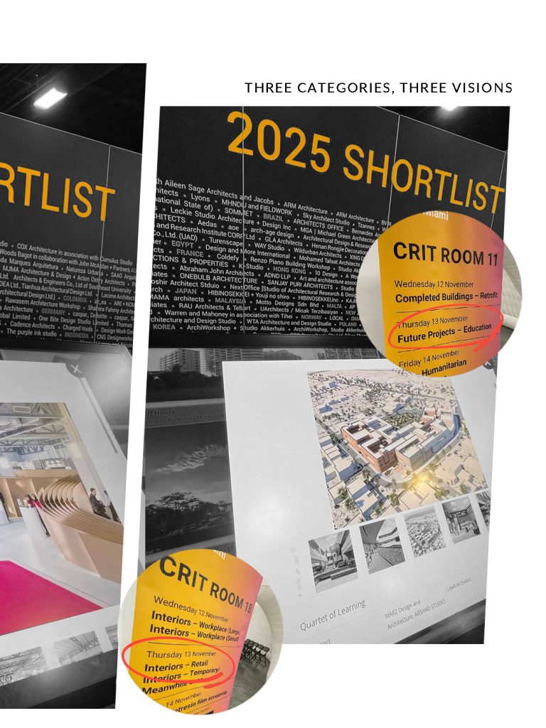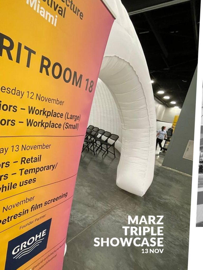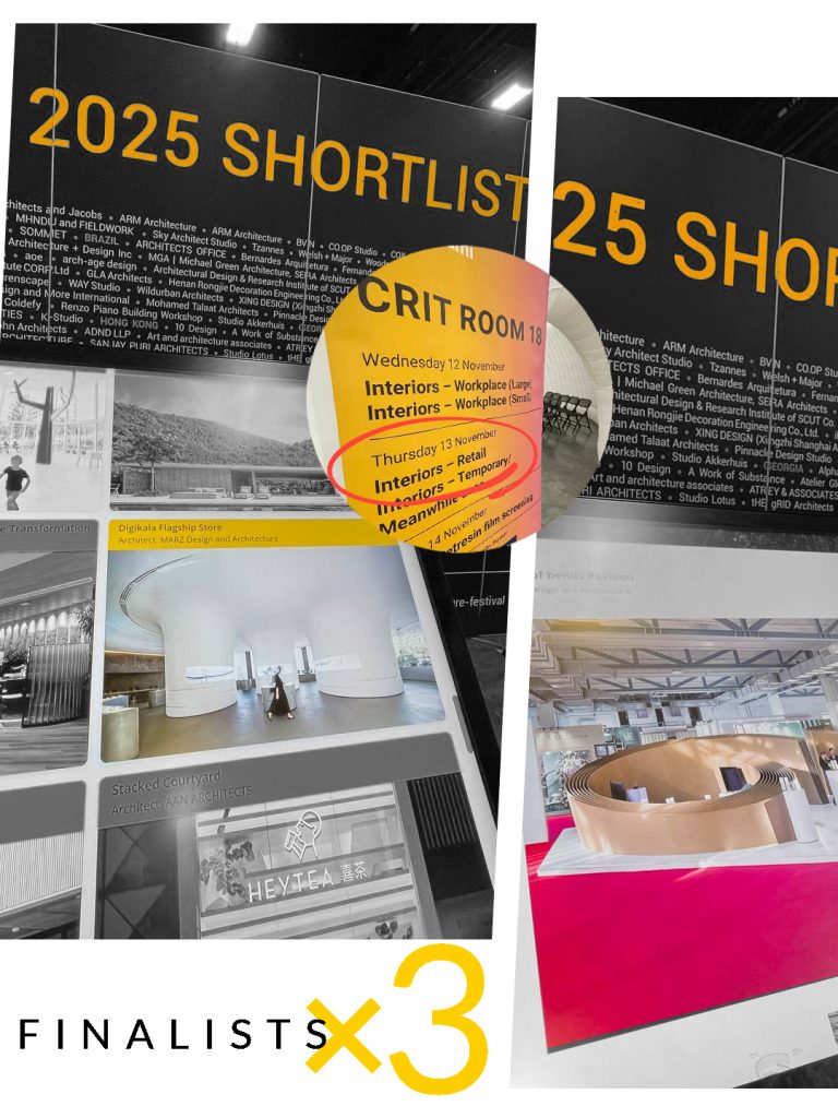 In November 2025, MARZ Design and Architecture participated in the World Architecture Festival (WAF) in Miami, one of the most prominent global platforms for architectural discourse and peer recognition. Three MARZ projects were shortlisted across different categories, reflecting the studio’s engagement with projects spanning retail, education, and temporary architecture.