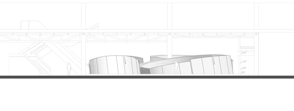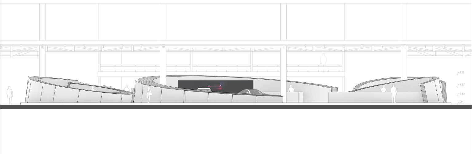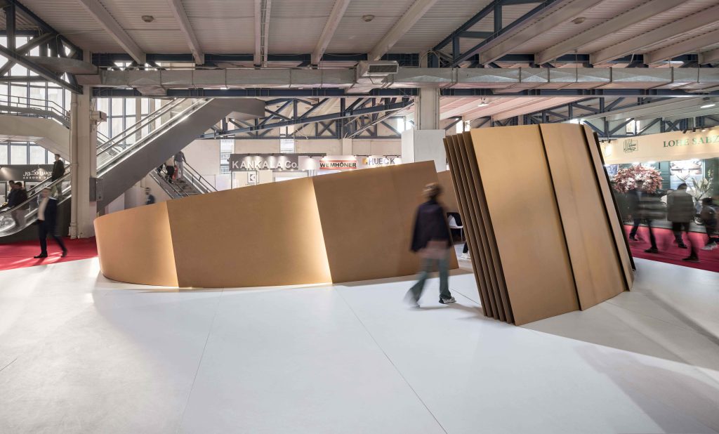 Between the paper-like spirals, interstitial spaces generate dynamic pathways that offer varied spatial experiences. The interplay of shifting contours across the spirals introduces a rhythmic flow, allowing visitors to navigate freely while experiencing an evolving sequence of perspectives. The design achieves a balance between ingenuity and creative sophistication, embodying both innovation and craftsmanship.